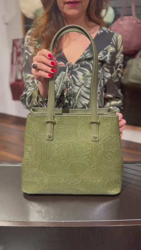 High-quality craftsmanship and flower patterned leather make this bag both stylish and durable. Experience the look and feel of Italian craftsmanship, in a bag designed to last.